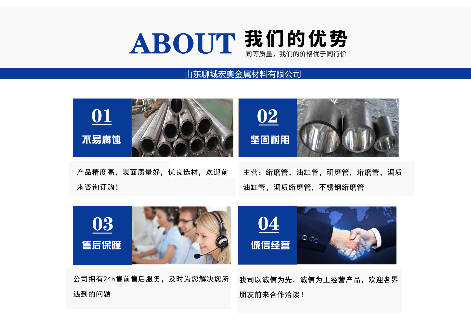 山東聊城宏奧金屬材料有限公司位于風(fēng)景秀麗的江北水城-聊城。地理位置優(yōu)越,交通便利。主營(yíng)絎磨管,油缸管,研磨管,珩磨管,調(diào)質(zhì)油缸管,調(diào)質(zhì)絎磨管,不銹鋼絎磨管等產(chǎn)品 廣泛應(yīng)用于礦山、起重、船舶、煤炭、運(yùn)輸、化工、科研、軍工等工業(yè)領(lǐng)域。 公司憑借雄厚的實(shí)力,豐富齊全的規(guī)格品種,完善的質(zhì)量保證,合理的價(jià)格,優(yōu)質(zhì)的服務(wù),不斷地受到新老用戶及業(yè)內(nèi)人士的肯定和信任,我們本著及用戶之所及,想用戶之所想的服務(wù)宗旨不斷地拼搏,進(jìn)取,在此對(duì)多年來支持我們的各行各業(yè)的新老朋友表示由衷的感謝,愿我們今后的合作更加愉快! 歡迎國(guó)內(nèi)外新老客戶來公司視察、蒞臨指導(dǎo)工作!...
